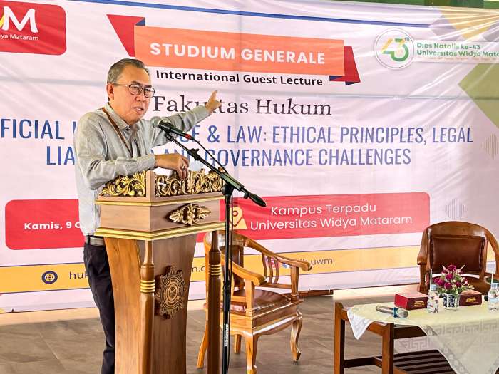 ‎Pesan itu mengemuka dalam Studium Generale bertema “Artificial Intelligence & Law: Ethical Principles, Legal Liabilities, and Governance Challenges” yang digelar di Pendopo Agung Kampus Terpadu UWM, Kamis (9/10), sebagai bagian dari peringatan Dies Natalis ke-43 UWM.