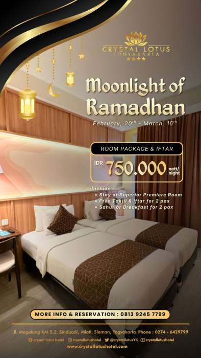 PERISTIWATERKINI.NET, Jogja – Crystal Lotus Hotel Yogyakarta langsung tancap gas menyambut Ramadhan 2026 dengan menghadirkan program menginap bertajuk Moonlight of Ramadhan.