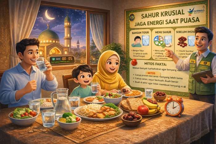 Melalui infografis edukasi pekan ini, Dinkes menyatakan, “Sahur adalah momen krusial menjaga energi sekaligus mencegah dehidrasi sepanjang puasa berlangsung.”