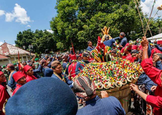 Dalam upacara ini, lima jenis gunungan diarak dan dibagikan kepada masyarakat sebagai simbol kemakmuran dan rasa syukur atas datangnya Idul Fitri.