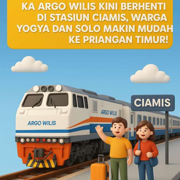 PERISTIWATERKINI.NET – PT KAI memberikan kabar gembira bagi masyarakat Yogyakarta, Solo, dan Priangan Timur. Mulai 15 Juli 2025, KA Argo Wilis yang melayani relasi Surabaya Gubeng–Bandung PP akan berhenti secara reguler di Stasiun Ciamis.
