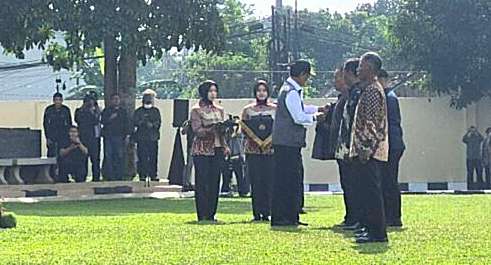 Apel Srawung Agung Jaga Warga, Sri Sultan HB X pakaikan rompi Jaga Warga pada sejumlah perwakilan dalam apel pada Jumat (21/11/2025) di halaman Polda DIY. (Wawan-Peristiwaterkini)