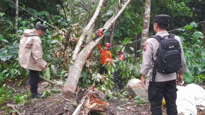 PERISTIWATERKINI.NET, Wonosobo – Tim gabungan Koramil 11/Kaliwiro bergerak cepat mengevakuasi pohon tumbang yang memutus aliran listrik dan menutup jalan penghubung Desa Tanjunganom–Grugu, Kamis (4/12/2025).