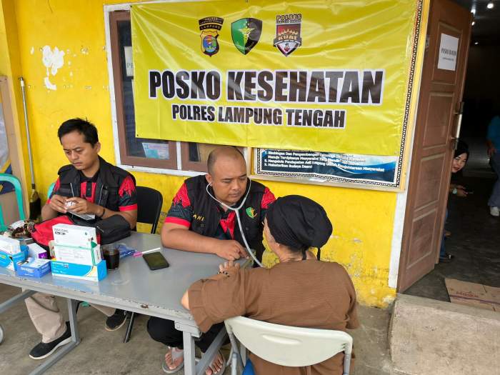 Lampung Tengah, Peristiwaterkini – Polres Lampung Tengah mengadakan bakti kesehatan berupa pengobatan gratis bagi masyarakat terdampak banjir di Kampung Sinar Banten, Kecamatan Bekri, Kabupaten Lampung Tengah, pada Minggu (19/1/2025).