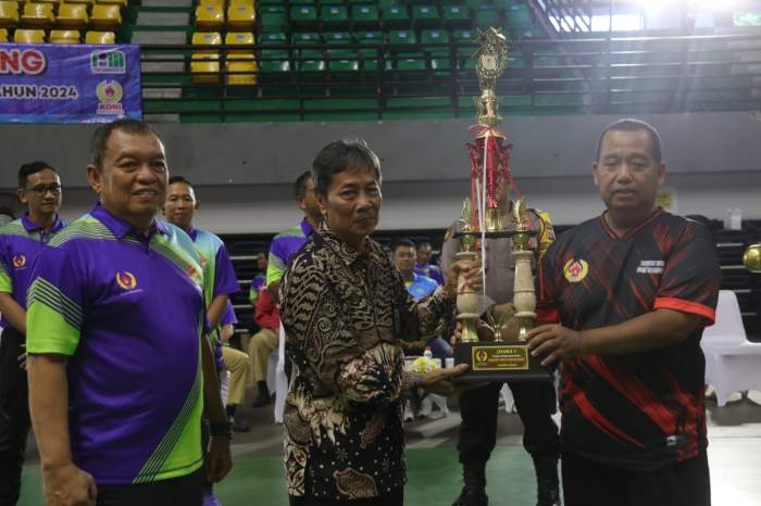 dengan memukul gong dan menyerahkan piala bergilir dari Kemantren Mantrijeron kepada Ketua Umum Komite Olahraga Nasional Indonesia (KONI) Kota Yogyakarta Aji Karnanto di GOR Amongrogo, Senin (2/12/2024).