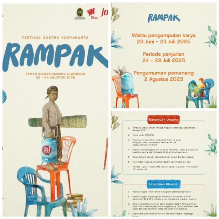 PERISTIWATERKINI.NET – Festival Sastra Yogyakarta (FSY) 2025 resmi digelar dengan menghadirkan sayembara puisi bertema “Rampak” sebagai wujud semangat kolaborasi dalam sastra.