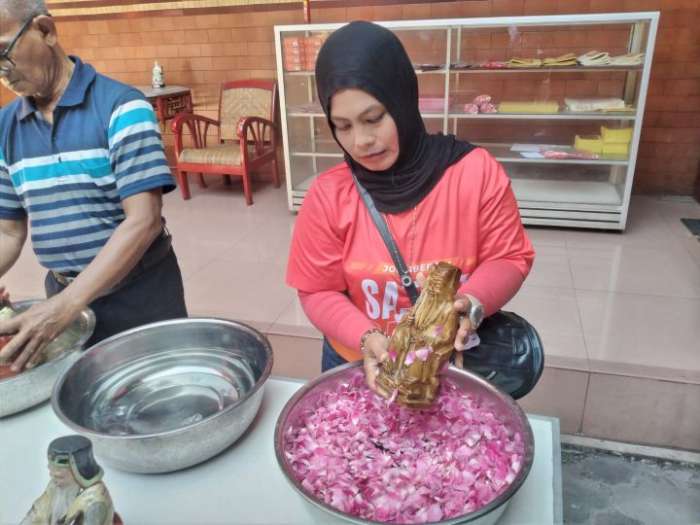 Selain memandikan patung, kemudian pengurus juga mengganti busana dewa-dewi dengan kain baru, sementara kain lama tetap mereka simpan dengan hormat.
