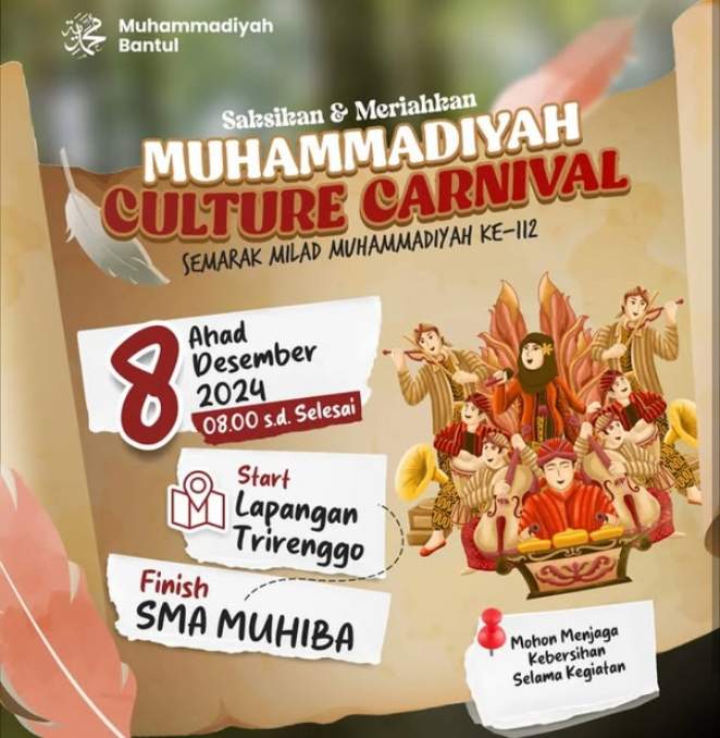 Jogja Peristiwaterkini – Menyemarakan rangkaian Milad Muhammadiyah ke 112, Pimpinan Daerah Muhammadiyah (PDM) Bantul akan mengelar Muhammadiyah Culture Carnival (MCC), pada Minggu 8 Desember 2024.