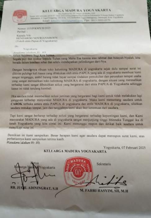 Keluarga Madura Yogyakarta (KMY) memberikan peringatan keras kepada etnis Papua yang dianggap sering meresahkan pemilik toko kelontong Madura.