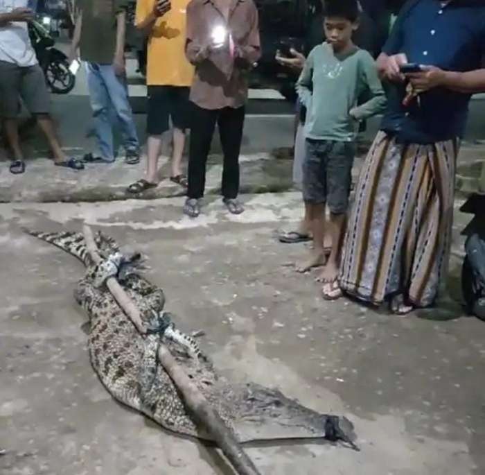 Video lain memperlihatkan buaya telah dibawa ke pemukiman warga, dikelilingi banyak orang yang penasaran dengan kejadian tersebut.